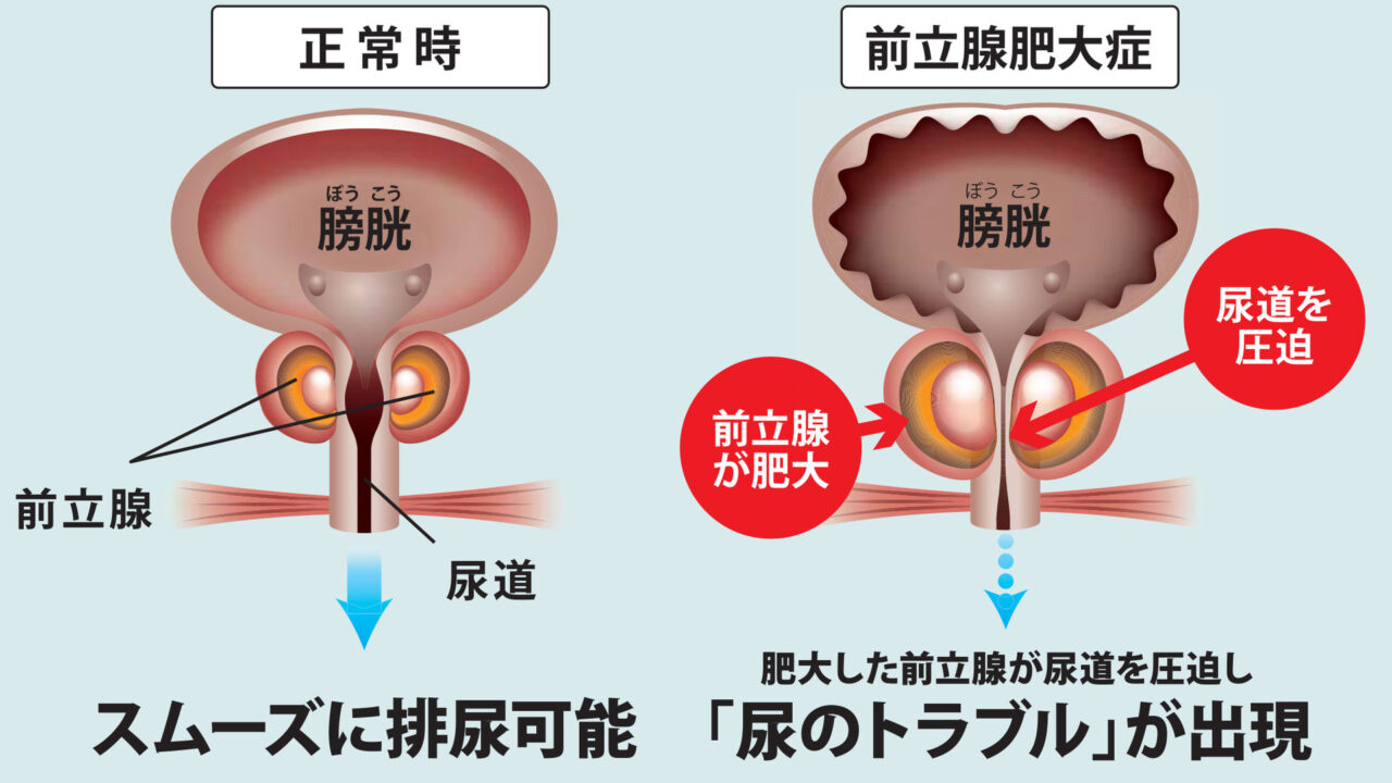 前立腺肥大症とは、前立腺が肥大することにより尿道が圧迫されて、排尿障害をきたす病気です。 50歳頃から加齢とともに増加し、50歳代男性では20~30%、80歳以上になると80~90%が前立腺肥大症になるといわれています。